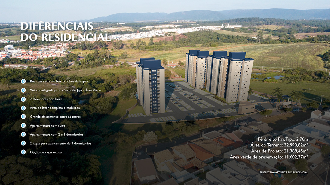 O Residencial Ilhas Gregas Itupeva é um empreendimento de destaque, com 32.990 m² de construção divididos em 6 torres, oferecendo 312 apartamentos em um cenário privilegiado pela beleza natural da Serra do Japi. Além disso, possui 11.602 m² de área verde de preservação, criando um ambiente único.