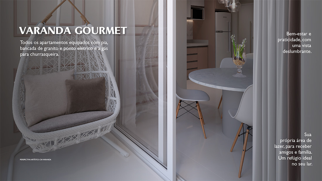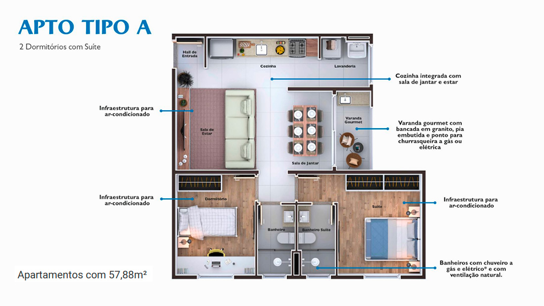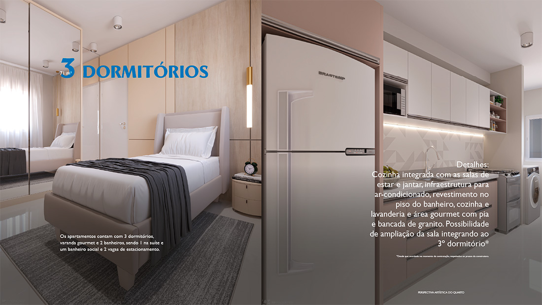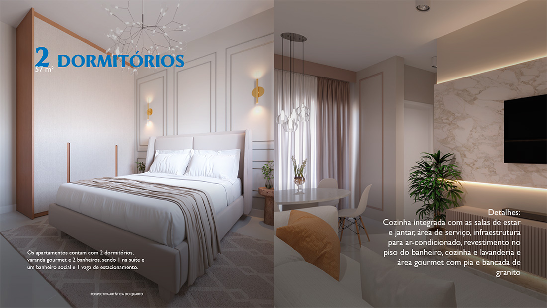 Uma cozinha integrada às áreas de estar e jantar, infraestrutura para ar-condicionado, revestimento de piso em áreas-chave como banheiro, cozinha e lavanderia, além de uma área gourmet equipada com pia e bancada de granito. Opção de ampliação da sala através da integração com um terceiro quarto.