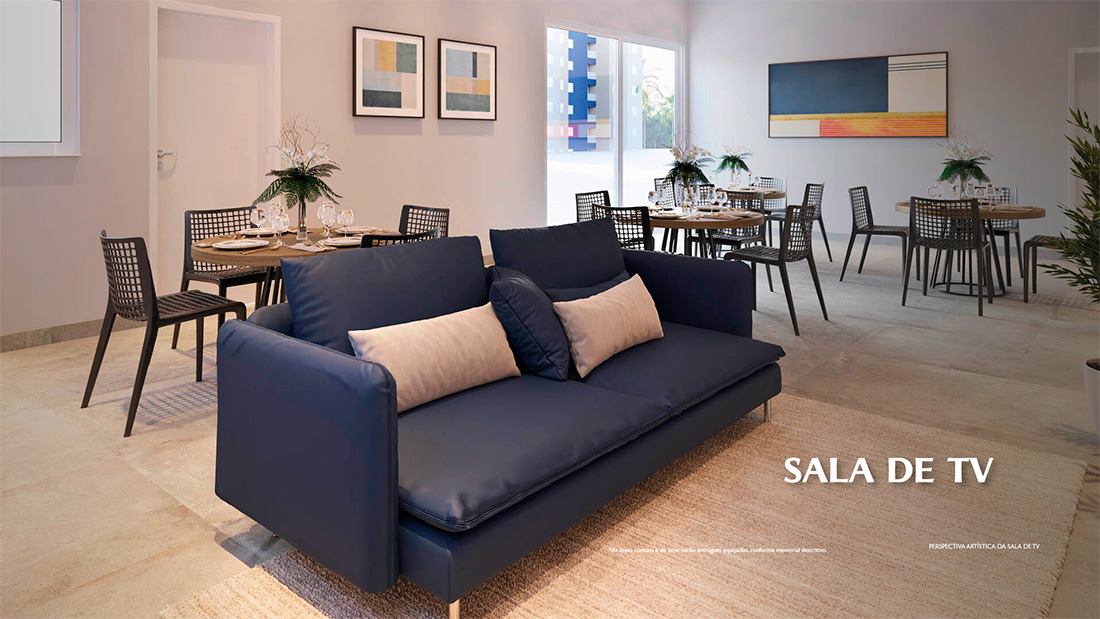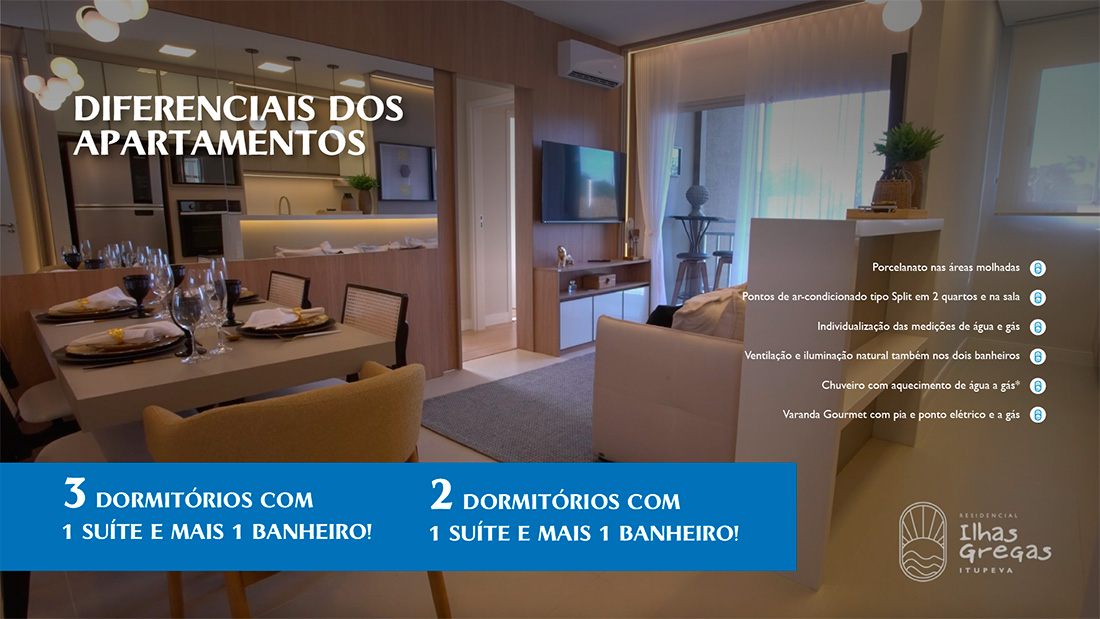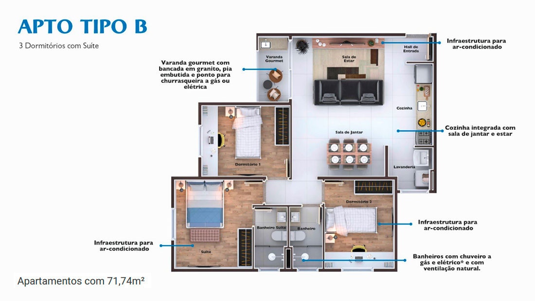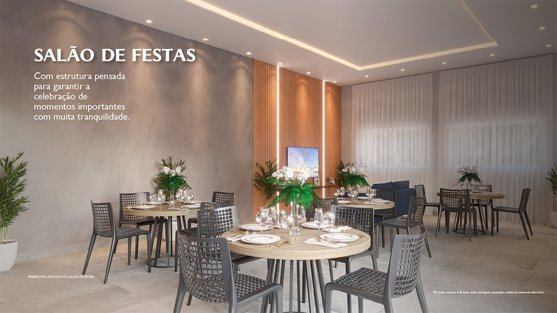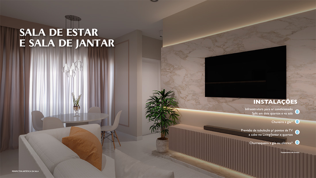 Uma cozinha integrada às áreas de estar e jantar, infraestrutura para ar-condicionado, revestimento de piso em áreas-chave como banheiro, cozinha e lavanderia, além de uma área gourmet equipada com pia e bancada de granito. Opção de ampliação da sala através da integração com um terceiro quarto.